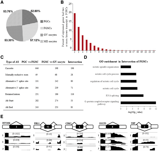 在雌性生殖系發(fā)育過程中,研究者發(fā)現(xiàn)FGSCs的可變剪接(AS)發(fā)生頻率最高(圖6A),可能有助于FGSCs的自我更新和分化。在FGSC階段具有兩個(gè)或更多個(gè)轉(zhuǎn)錄物的已知基因的比例也顯示在圖6B中。
