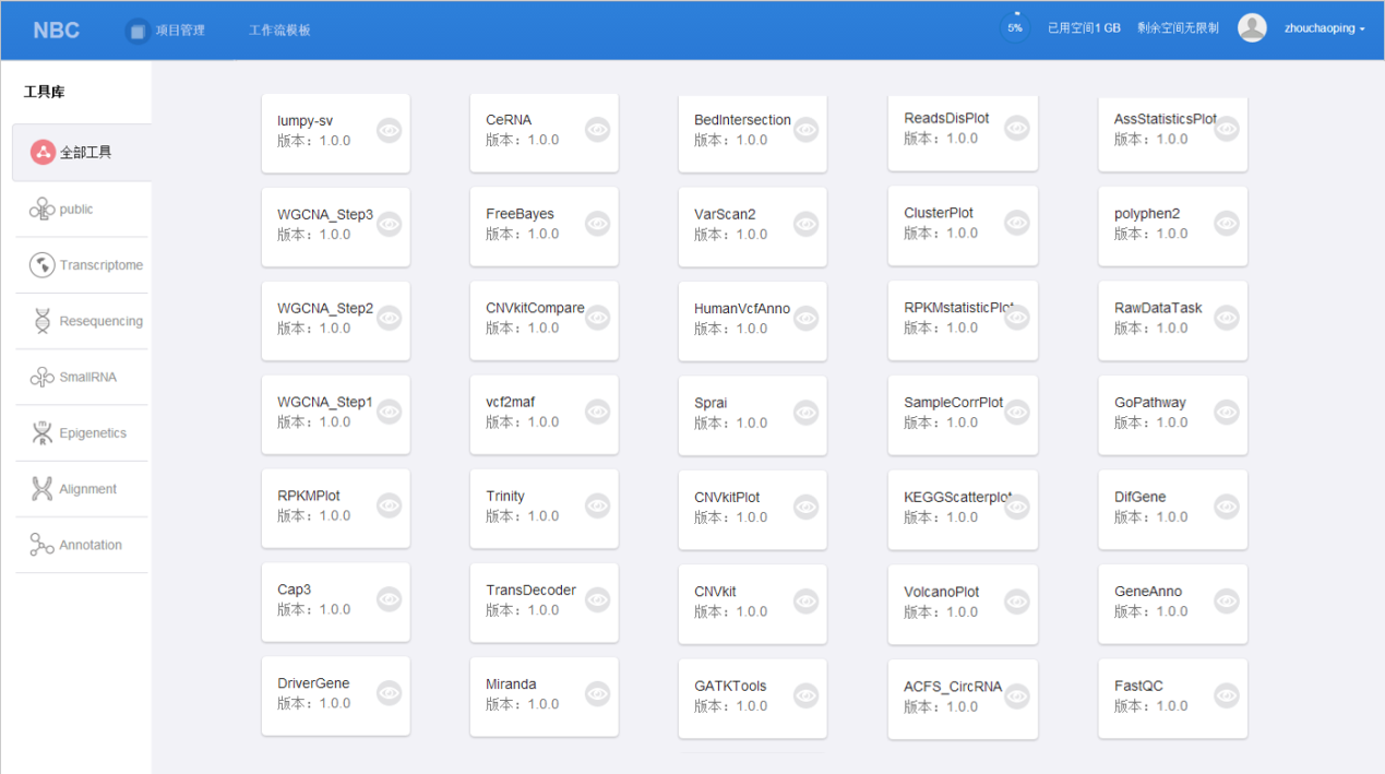NovelBrain在作為烈冰生產(chǎn)系統(tǒng)的過程中,不斷地上線并積累各類數(shù)據(jù)分析工具,截止V4.0版本已包含400多個分析工具,其中很多分析工具譬如RnaSeqMap,一個工具就包含了hisat2、star、mapsplice、tophat這4個分析軟件。因此實際整合軟件數(shù)量1000+,不僅包含二代測序分析軟件,還覆蓋GWAS相關(guān)、motif預(yù)測、基因注釋等多個生物信息領(lǐng)域。