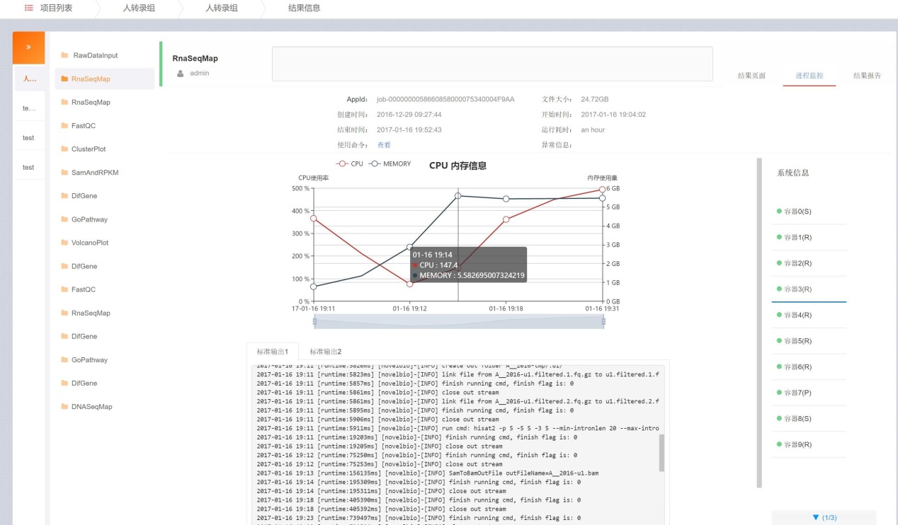 此外,對于并行計算的任務(wù),NovelBrain也有完善的監(jiān)控系統(tǒng)對每一個容器的cpu內(nèi)存進(jìn)行監(jiān)控,同時將運行的命令和日志自動存檔,方便未來給第三方機構(gòu)重現(xiàn)結(jié)果。
