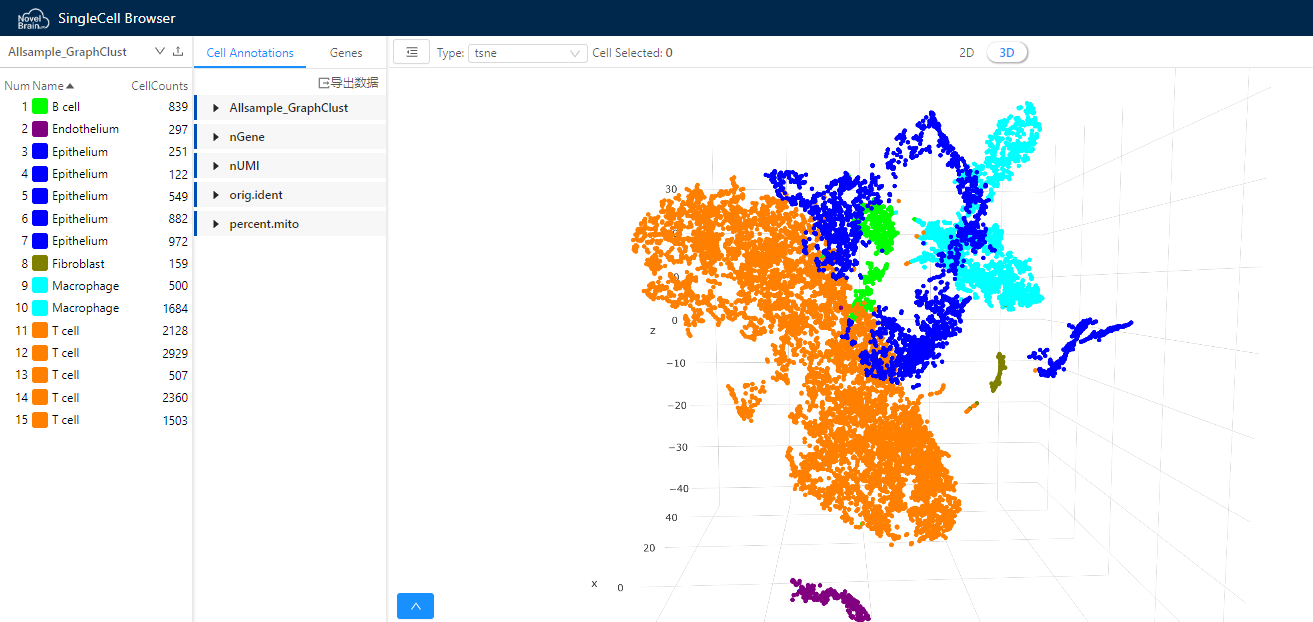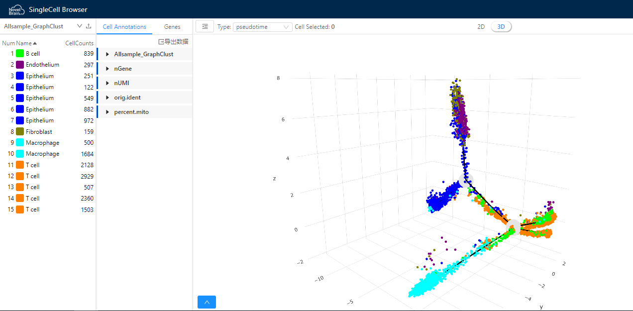 單細(xì)胞瀏覽器可以針對t-SNE圖和pseudotime結(jié)果進(jìn)行三維立體展示,方便大家可以更加直觀立體的觀察細(xì)胞分布和聚類情況。