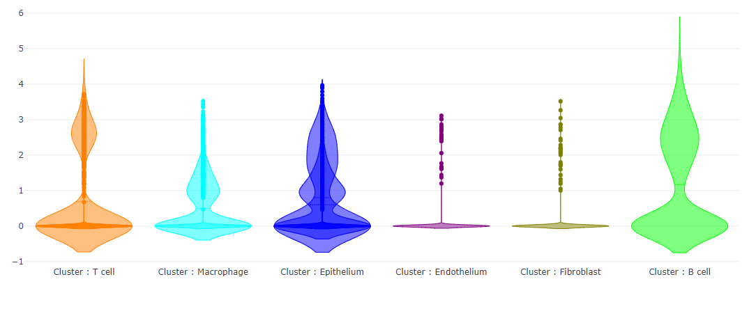 單細(xì)胞瀏覽器可以通過基因表達(dá)量、Heatmap、Violin圖三種表現(xiàn)形式對基因在Cluster中表達(dá)情況進(jìn)行多方面展示,最大程度上滿足用戶需求。