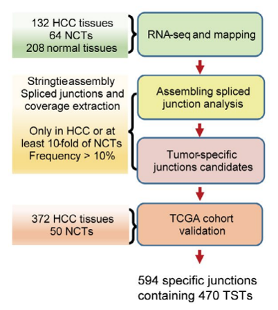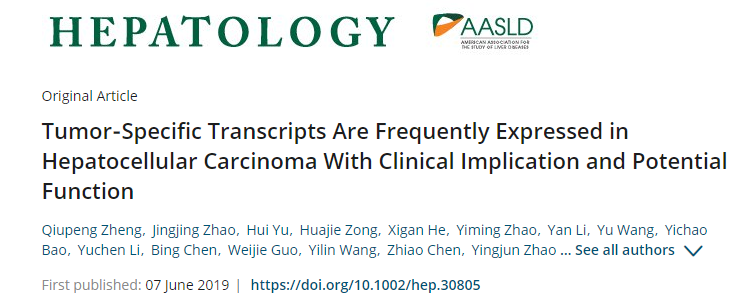 2019年6月7日,上海復(fù)旦大學(xué)附屬腫瘤醫(yī)院的黃勝林課題組與何祥火課題組合作研究了肝細胞癌(HCC)中廣泛存在的TSTs。該研究在烈冰生信團隊可變剪接分析聯(lián)合轉(zhuǎn)錄組測序的幫助下,鑒定并表征了HCC中高頻表達的TSTs,并描述了其在臨床診斷和治療中的作用。該研究成果以“Tumor-specific Transcripts are Frequently Expressed in Hepatocellular Carcinoma with Clinical Implication and Potential Function”為題發(fā)表在《Hepatology》(IF=14.971)期刊上。