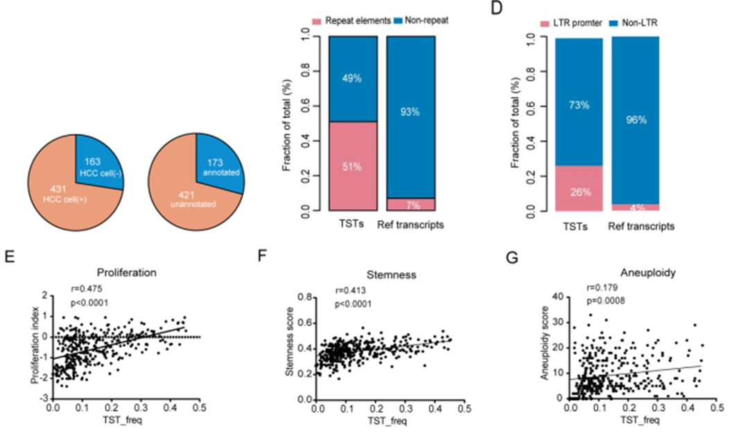 該研究分析了正常組織和肝癌組織的RNA測序數(shù)據(jù),發(fā)現(xiàn)了470個TSTs,其中未注釋的長鏈RNA占72.9%。近一半的TSTs來自基因間區(qū),是由含有長末端重復(fù)序列(LTR元件)的、新的轉(zhuǎn)錄起始位點產(chǎn)生。