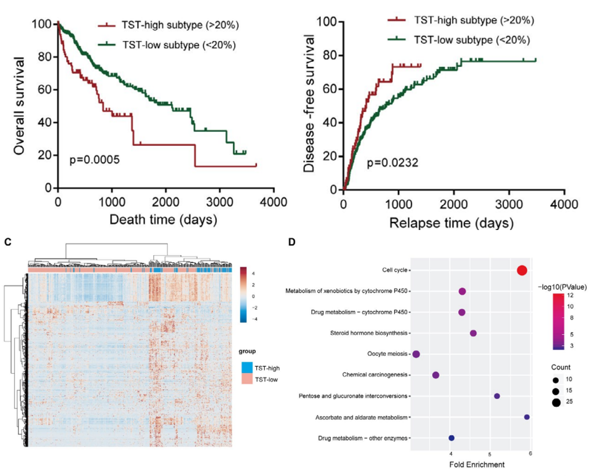 如圖2所示,根據(jù)TSTs的表達量將患者分為兩個類型:TST-high亞型(占患者總數(shù)的23%)和TST-low亞型,并觀察兩種亞型的患者生存率及無病生存期,發(fā)現(xiàn)TST-high亞型的預(yù)后和無病生存期明顯下降。與較差的預(yù)后相關(guān)。