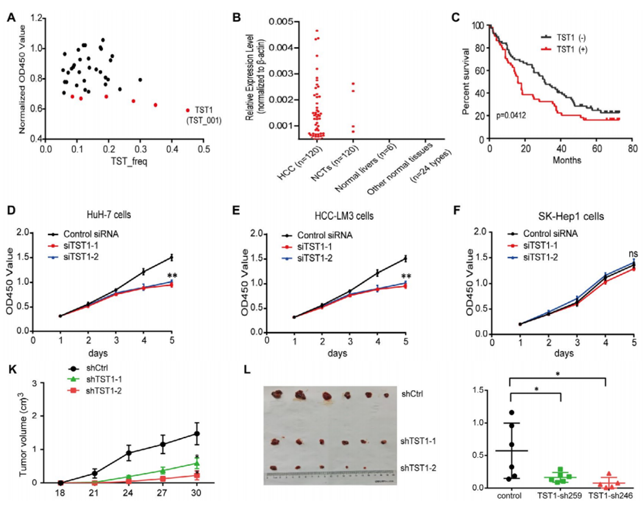 研究者進一步使用小干擾rna(siRNAs)對TSTs進行功能性篩選,發(fā)現(xiàn)一種新的TST(稱為TST1),將其沉默能夠顯著抑制細胞增殖,而且qRT-PCR分析發(fā)現(xiàn)TST1主要在肝癌組織中表達(41.7%)。通過抑制TST1的表達,細胞的致瘤能力明顯下降,腫瘤的重量和體積變小??偟膩碚f,TST1具有細胞增殖和腫瘤形成的能力(圖3)。