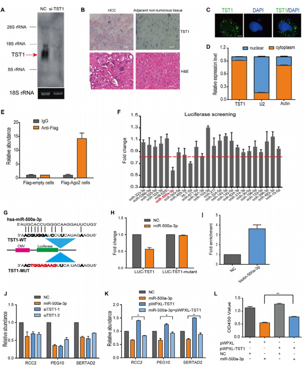 通過RNA免疫共沉淀、ISH實驗證明TST1主要分布于細胞質(zhì)中。篩選與TST1結(jié)合的miRNA以及RNA-Seq數(shù)據(jù)分析發(fā)現(xiàn)TST1可以直接與miR-500a-3p結(jié)合,促進細胞增殖(圖4)。