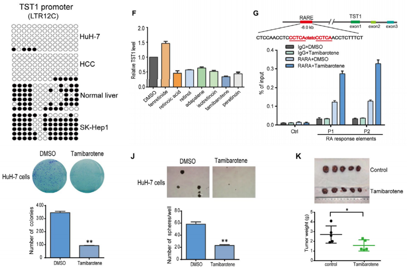 如圖5,研究發(fā)現(xiàn)TST1由受DNA甲基化及維甲酸(RA)相關(guān)藥物調(diào)控的LTR12C啟動子產(chǎn)生。RA和tamibarotene(維甲酸類化合物)可以通過與RA響應(yīng)元件序列結(jié)合直接抑制TST1的表達,從而有效抑制細胞增殖及腫瘤的形成,并提出tamibarotene可能對TST1表達的肝癌患者有治療效果。