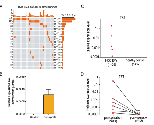 通過分析71例HCC患者血液細胞外囊泡(EVs)的RNA測序數(shù)據(jù),發(fā)現(xiàn)56%的HCC患者在血液EVs中檢測到TSTs,尤其是TST1(占比達到32.5%)。但是在健康患者中沒有檢測到TST1,結(jié)合HCC患者術(shù)后TST1表達顯著下降,認為血液EVs中TSTs的表達水平可用于預(yù)測患者的預(yù)后情況(圖6)。