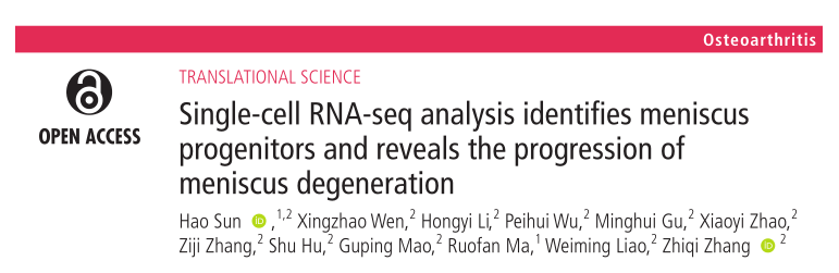 2019年12月7日,中山大學(xué)附屬第一醫(yī)院廖威明教授課題組和張志奇教授課題組通過ScRNA-Seq詳細(xì)描繪半月板的細(xì)胞組成,鑒定出一種在半月板組織工程中具有應(yīng)用前景的祖細(xì)胞,并證明了半月板的退變機(jī)制。并且通過TGFβ1治療有效緩解半月板退變提出一種半月板退變的潛在治療策略。此次研究工作中的單細(xì)胞RNA測序?qū)嶒?yàn)與數(shù)據(jù)分析由烈冰科技參與支持。該研究成果以“Single- cell RNA- seq analysis identifies meniscus progenitors and reveals the progression of meniscus degeneration”為題發(fā)表于《Annals of the Rheumatic Diseases》(IF=14.299)期刊。