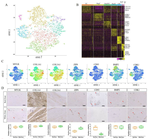 ① 內(nèi)皮細(xì)胞(EC);②軟骨細(xì)胞祖細(xì)胞 (CPC);③調(diào)節(jié)性軟骨細(xì)胞(RegC);④纖維軟骨細(xì)胞(FC);⑤預(yù)肥大軟骨細(xì)胞(PreHTC);⑥纖維軟骨細(xì)胞祖細(xì)胞(FCP);⑦增殖纖維軟骨細(xì)胞(ProFC)。并進(jìn)一步通過免疫組化來確定各細(xì)胞亞群的分布,F(xiàn)CP主要分布于半月板表面,RegC在半月板中部,EC存在于紅區(qū)血管周圍 ,而PreHTC分布于白區(qū)。