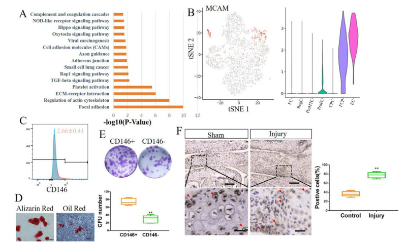 研究者通過擬時序分析發(fā)現(xiàn)FCP和EC存在于分化軌跡的起始處。為了進(jìn)一步探究FCP是否具有祖細(xì)胞的性質(zhì),根據(jù)高表達(dá)基因分選出CD146+原代半月板細(xì)胞,并對其進(jìn)行分化和克隆能力的驗(yàn)證。通過集落形成和多向分化潛能分析實(shí)驗(yàn)驗(yàn)證CD146+細(xì)胞可以向成骨細(xì)胞和脂肪細(xì)胞分化并形成集落。提示在健康人半月板細(xì)胞中,FCP具有祖細(xì)胞的特性。