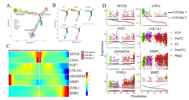 為了研究FCP的分化軌跡,研究者選取了FCP、ProFC、FC、PreHTC和RegC重新構(gòu)建了一條新的分化軌跡(圖3A)。軌跡起始部位由FCP和ProFC組成,其后為PreHTC,而末端Fate 1為FC,末端Fate 2由RegC組成(圖3B)。進(jìn)一步分析FCP向 Fate1和Fate2分化過程中各亞群細(xì)胞基因表達(dá)模式(圖3C、3D)。