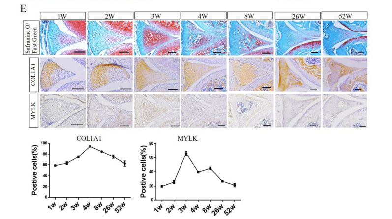 為了確定細(xì)胞分化軌跡,研究者分析了各亞群細(xì)胞的差異表達(dá)基因及表達(dá)模式,并研究了體內(nèi)半月板發(fā)育過程,觀察1、2、3、4、8、26和52周小鼠半月板中marker基因的表達(dá)情況(圖3E):COL1A1出生后表達(dá)逐漸增強(qiáng),在4周時達(dá)到高峰,隨后表達(dá)量逐漸降低;MYLK在3周后,表達(dá)量顯著下降。體內(nèi)實(shí)驗(yàn)的基因表達(dá)趨勢與測序分析得出的趨勢相一致,進(jìn)一步驗(yàn)證了FCP的分化軌跡。
