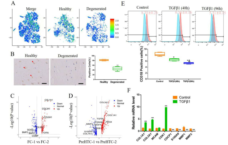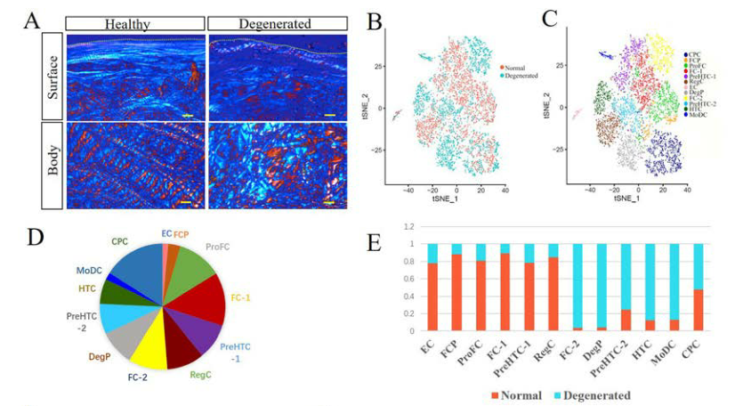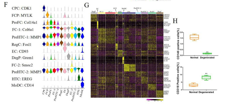 研究者首先通過觀察組織結(jié)構(gòu)變化,發(fā)現(xiàn)退變半月板的膠原纖維結(jié)構(gòu)紊亂(圖4A)。然后對健康和退變半月板進(jìn)行ScRNA-Seq分析(圖4B-E),發(fā)現(xiàn)退變半月板的各細(xì)胞亞群占比發(fā)生顯著變化,并發(fā)現(xiàn)三個新的亞群:(1)單核細(xì)胞來源的樹突狀細(xì)胞(MoDC);(2)肥大軟骨細(xì)胞(HTC);(3)退變半月板祖細(xì)胞(DegP)。