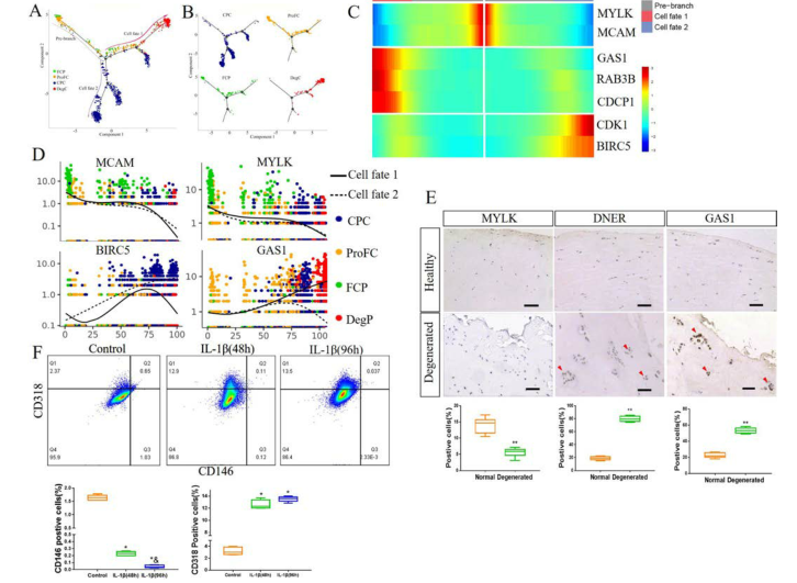 研究者通過集落形成和多向分化潛能分析實(shí)驗(yàn)發(fā)現(xiàn)DegP(CD318+細(xì)胞)可以形成集落并向多種細(xì)胞分化,證明在退變半月板中,DegP具有祖細(xì)胞特性。因此,研究者重新選取FCP、ProFC、CPC和DegP四個亞群來構(gòu)建分化軌跡,軌跡起始端主要由FCP和ProFC組成,F(xiàn)ate 1和Fate 2分別由DegP和CPC組成(圖5A、5B)。