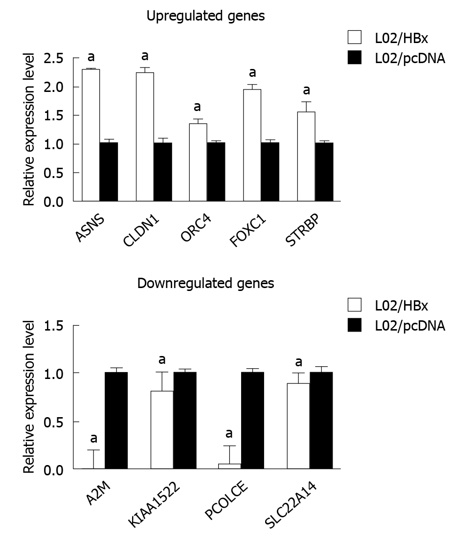 完成對差異基因的分析之后,文章接著對miRNA的表達(dá)進(jìn)行差異篩選。結(jié)果顯示,與L02/pcDNA細(xì)胞相比,L02/HBx細(xì)胞中6個(gè)miRNA表達(dá)發(fā)生下調(diào),16個(gè)miRNA表達(dá)上調(diào)(Figure3)。研究者對其中4個(gè)差異miRNA進(jìn)行 qPCR表達(dá)量驗(yàn)證,驗(yàn)證結(jié)果與測序結(jié)果一致。