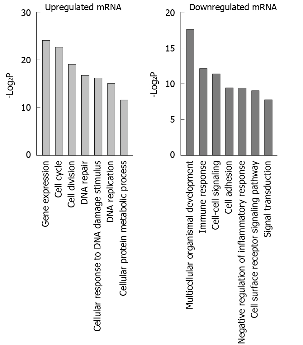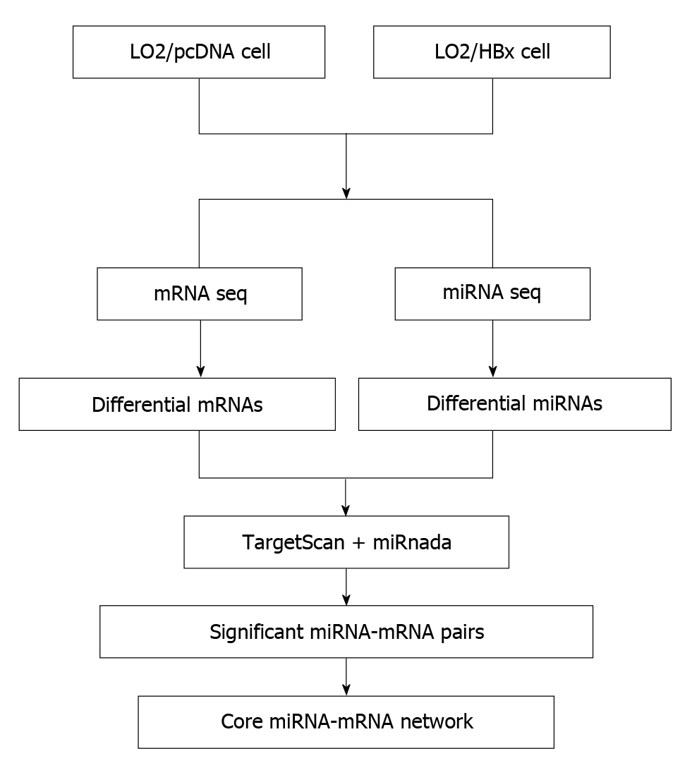 研究者建立了可穩(wěn)定表達(dá)HBx基因的人類肝臟細(xì)胞系L02,命名為L02/HBx,作為實(shí)驗(yàn)組;以轉(zhuǎn)染了空白質(zhì)粒的L02/pcDNA作為對照組,分別進(jìn)行mRNA-Seq和miRNA-Seq,篩選出L02/HBx組中發(fā)生差異表達(dá)的mRNA和miRNA。之后借助GO分析和KEGG Pathway富集分析來評估候選分子標(biāo)志物(Biomarker)的功能,并通過調(diào)控網(wǎng)絡(luò)圖的構(gòu)建分析差異miRNA和mRNA的相互作用關(guān)系。