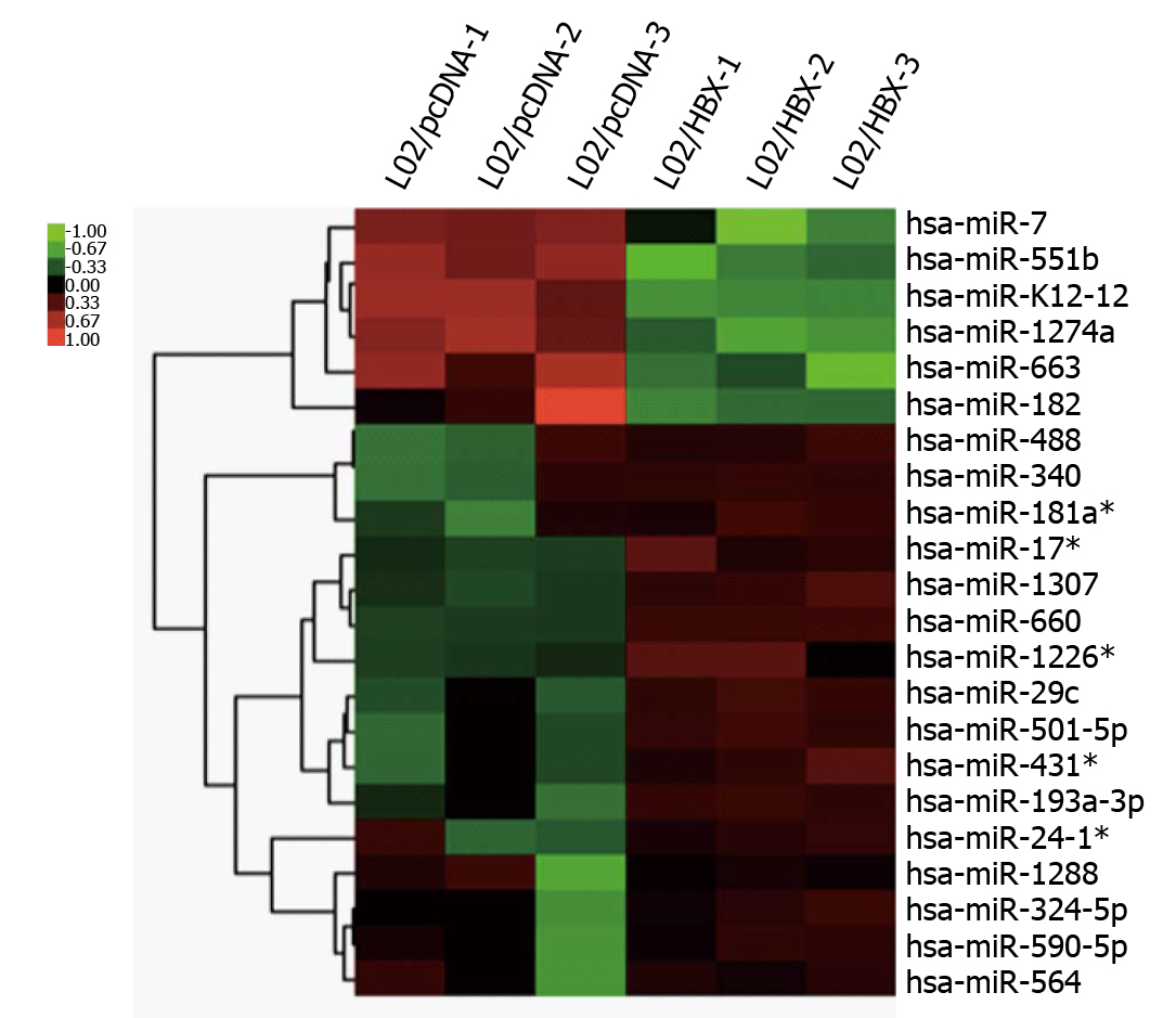 Figure3. L02/HBx細(xì)胞與L02/pcDNA細(xì)胞之間發(fā)生差異表達(dá)的miRNA