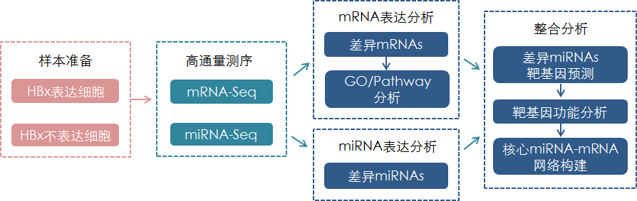 本篇文章以“Integrated analysis of microRNA and mRNA expression profiles in HBx-expressing hepatic cells”為題發(fā)表于 World Journal of Gastroenterology雜志,研究團(tuán)隊(duì)來自中南大學(xué)湘雅醫(yī)院范學(xué)工教授課題組,NovelBio在該工作中提供了高通量測序和生物信息分析服務(wù)及技術(shù)支持。該研究對轉(zhuǎn)染HBx基因的肝細(xì)胞進(jìn)行了轉(zhuǎn)錄組測序(RNA-Seq)和miRNA測序(miRNA-Seq),并通過對測序數(shù)據(jù)的分析繪制了miRNA-mRNA核心調(diào)控網(wǎng)絡(luò),為HBV相關(guān)HCC的分子機(jī)制研究提供了新的思路和研究靶點(diǎn)。