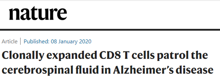 2020年1月8日,美國斯坦福大學(xué)的Mark M Davis和Tony Wyss-Coray團(tuán)隊(duì)發(fā)現(xiàn)在AD患者的腦脊液中存在克隆擴(kuò)增的T細(xì)胞,同時(shí)還發(fā)現(xiàn)其中一類T細(xì)胞與認(rèn)知能力具有相關(guān)性,通過單細(xì)胞TCR的分析發(fā)現(xiàn)克隆擴(kuò)增的T細(xì)胞能夠識(shí)別EB病毒的兩種不同抗原。該研究成果以Clonally expanded CD8 T cells patrol the cerebrospinal fluid in Alzheimer’s disease為題發(fā)表在Nature雜志上。
