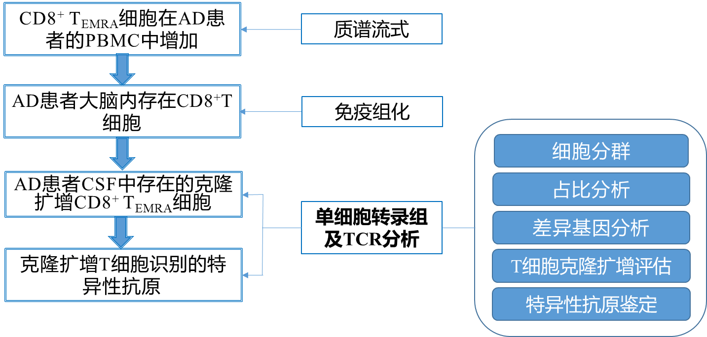 T細(xì)胞受體(T cell receptor, TCR)與抗原的相互作用對(duì)于適應(yīng)性免疫至關(guān)重要。當(dāng)T細(xì)胞識(shí)別同源抗原(cognate antigen)時(shí)會(huì)發(fā)生克隆擴(kuò)增。而且TCR序列具有多樣性,對(duì)于單個(gè)T細(xì)胞具有特異的TCR序列。因此,發(fā)現(xiàn)兩個(gè)或兩個(gè)以上具有相同TCR序列的T細(xì)胞便可認(rèn)為是T細(xì)胞發(fā)生克隆擴(kuò)增的證據(jù)。目前已有研究發(fā)現(xiàn)AD患者外周的T細(xì)胞分布、功能以及細(xì)胞因子分泌的變化,但導(dǎo)致這些變化的抗原目前仍不清楚。