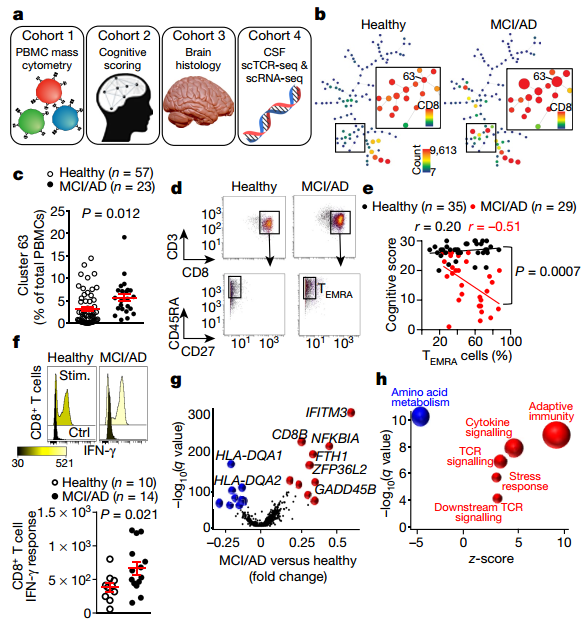 研究者通過多個(gè)隊(duì)列分析來評(píng)估AD的適應(yīng)性免疫(圖1a),使用質(zhì)譜流式細(xì)胞技術(shù)研究了AD患者和前驅(qū)輕度認(rèn)知障礙(MCI)患者的外周血單個(gè)核細(xì)胞(PBMC)。然后使用聚類計(jì)算方法(spanning-tree progression analysis of density-normalized events,SPADE)進(jìn)行聚類分析,發(fā)現(xiàn)患有MCI或AD的患者存在細(xì)胞數(shù)顯著增多的CD8+群體(圖1b),即cluster 63。該細(xì)胞群體的標(biāo)志物與CD3+CD8+CD27- T效應(yīng)記憶CD45RA+(TEMRA)細(xì)胞標(biāo)志物相一致(圖1d),是一種能夠分泌促炎性細(xì)胞因子和細(xì)胞毒性分子的具有效應(yīng)性功能的細(xì)胞群體。