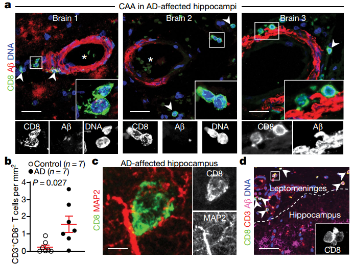 接下來研究者為了確定AD患者的大腦中是否存在CD8+ T細(xì)胞,對(duì)Cohort 3(圖1a)中正常人和AD患者的大腦進(jìn)行CD8和Aβ免疫組化實(shí)驗(yàn),以及CD8+ T細(xì)胞與大腦血管接近程度的分析。發(fā)現(xiàn)在三個(gè)AD大腦海馬區(qū),伴有腦淀粉樣血管病變的血管周隙中存在大量血管外CD8+ T細(xì)胞(圖2a),受AD影響的海馬中CD3+CD8+ T細(xì)胞明顯多于對(duì)照海馬(圖2b),且CD8+ T細(xì)胞與微管相關(guān)蛋白2 (MAP2)+神經(jīng)元具有一定的相關(guān)性(圖2c)。最后研究者從AD患者的大腦海馬附近的軟腦膜中也檢測(cè)到了CD3+CD8+ T細(xì)胞(圖2d)。