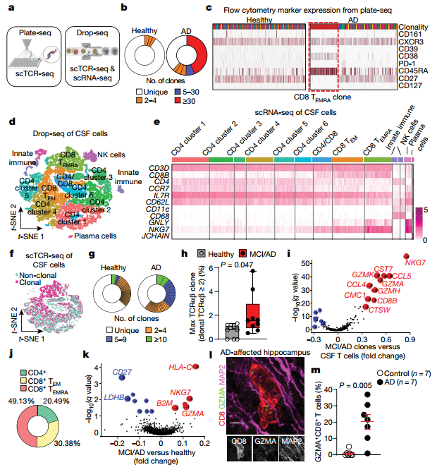 研究者使用drop-seq對(duì)CSF細(xì)胞進(jìn)行細(xì)胞分群時(shí)同樣發(fā)現(xiàn)大多數(shù)CSF細(xì)胞是T細(xì)胞(圖3d,e)。然后對(duì)這些細(xì)胞進(jìn)行了單細(xì)胞TCR測(cè)序(scTCR-seq),發(fā)現(xiàn)來自MCI或AD患者的CSF細(xì)胞中有許多高度擴(kuò)增的CD8+克隆,而對(duì)照組則相反(圖3f,g,h)。通過差異表達(dá)分析發(fā)現(xiàn)MCI和AD中高度擴(kuò)增的克?。淳哂形鍌€(gè)以上相同TCRαβ序列的T細(xì)胞)表現(xiàn)出細(xì)胞毒性效應(yīng)基因的表達(dá)增加(圖3i)。通過占比分析發(fā)現(xiàn)49.13%的克隆擴(kuò)增細(xì)胞是CD8+ TEMRA細(xì)胞(圖3j),且MCI和AD中的這類細(xì)胞同樣表現(xiàn)為細(xì)胞毒性效應(yīng)基因表達(dá)的增加。尤其在MCI和AD病患中高表達(dá)影響認(rèn)知的衰老因子人類白細(xì)胞抗原C(HLA-C)和β-2-微球蛋白(B2M)以及其他與AD相關(guān)的基因。(圖3k)。研究者還發(fā)現(xiàn)CD8+ T細(xì)胞中GZMA基因的表達(dá)(圖3l)以及AD患者海馬中GZMA+CD8+細(xì)胞具有更高的百分比(圖3m)。