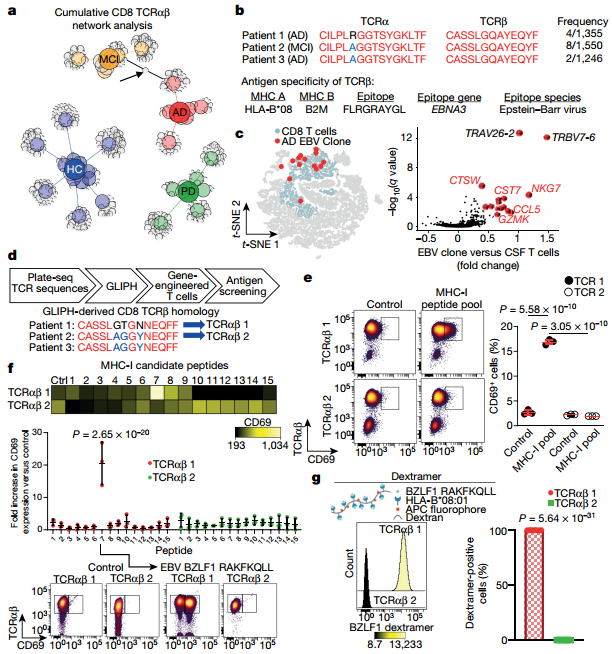 接下來,研究者希望確定是何種抗原引起了CD8+ TEMRA細(xì)胞的克隆擴(kuò)增。通過構(gòu)建TCRαβ序列的未加權(quán)網(wǎng)絡(luò)發(fā)現(xiàn)一例MCI和一例AD患者間具有一個(gè)共享的克隆,而另一例AD患者共享了其中的TCRβ序列,這條TCRβ序列(CASSLGQAYEQYF)對(duì)一種皰疹病毒EBV的EBNA3A抗原(Herpesviridae Epstein–Barr nuclear antigen 3)具有特異性(圖4b),并在該克隆中發(fā)現(xiàn)細(xì)胞毒性效應(yīng)基因表達(dá)增加(圖4c)。隨后研究者使用GLIPH算法對(duì)未知的TCR序列進(jìn)行特異性抗原的確定。發(fā)現(xiàn)AD患者共享的TCRβ鏈(CASSLAGGYNEQFF)與第三位AD患者的TCRβ鏈(CASSLGTGNNEQFF)具有同源性(圖4d)。