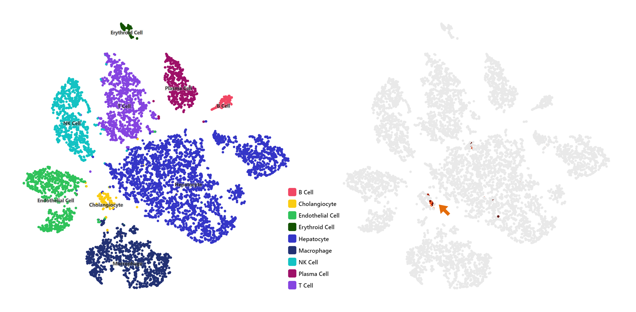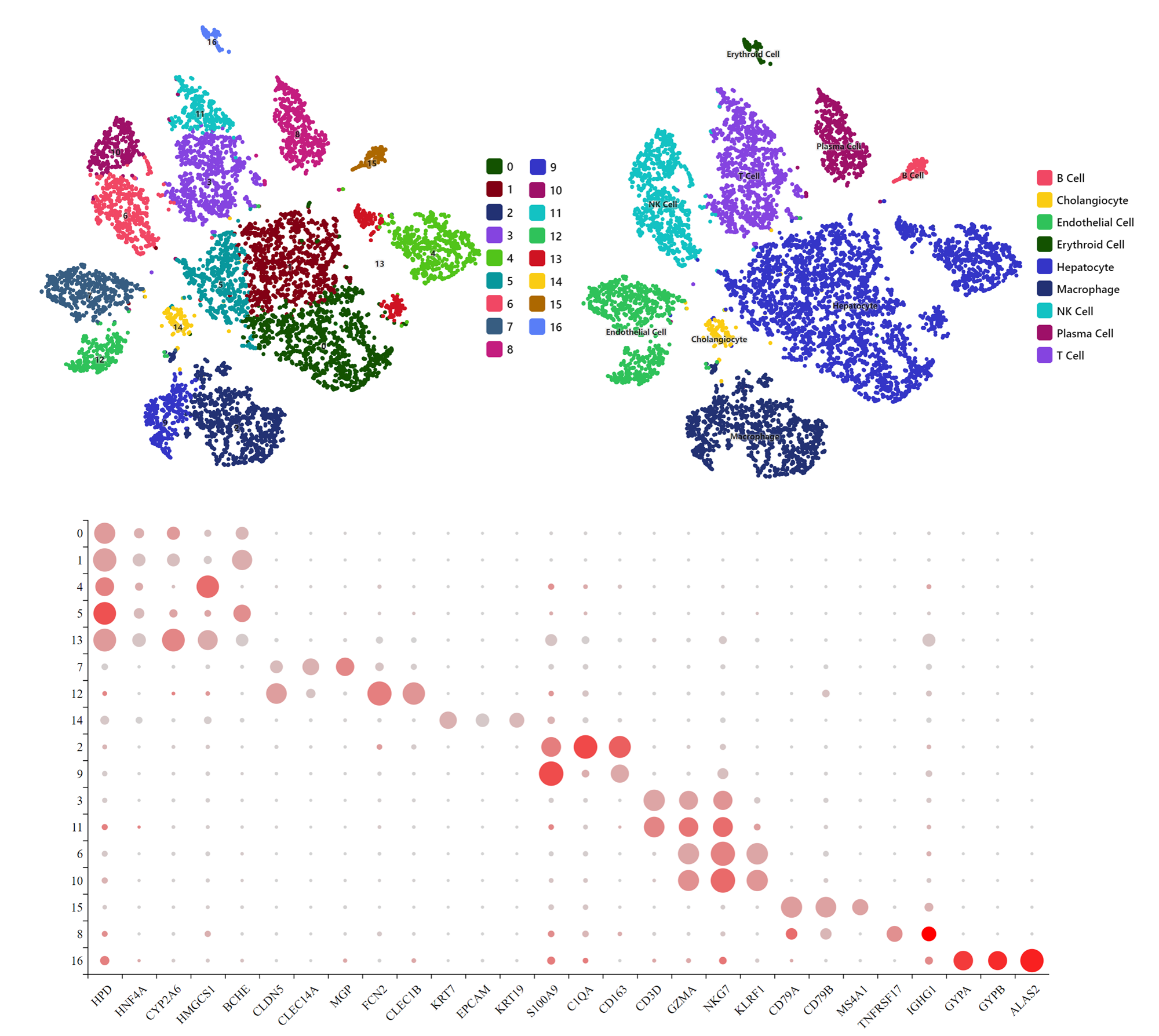 分析結(jié)果:通過(guò)單細(xì)胞瀏覽器(SingleCell Browser)對(duì)Marker Gene的表達(dá)進(jìn)行檢索,可以對(duì)細(xì)胞類型進(jìn)行初步鑒定,發(fā)現(xiàn)共有肝細(xì)胞、肝竇內(nèi)皮細(xì)胞、膽管細(xì)胞、巨噬細(xì)胞、T細(xì)胞、NK細(xì)胞、B細(xì)胞、漿細(xì)胞以及一小部分紅細(xì)胞,并在瀏覽器上直接生成定義好細(xì)胞類型的t-SNE圖以及相關(guān)Marker Gene的Bubble Plot(圖1)。