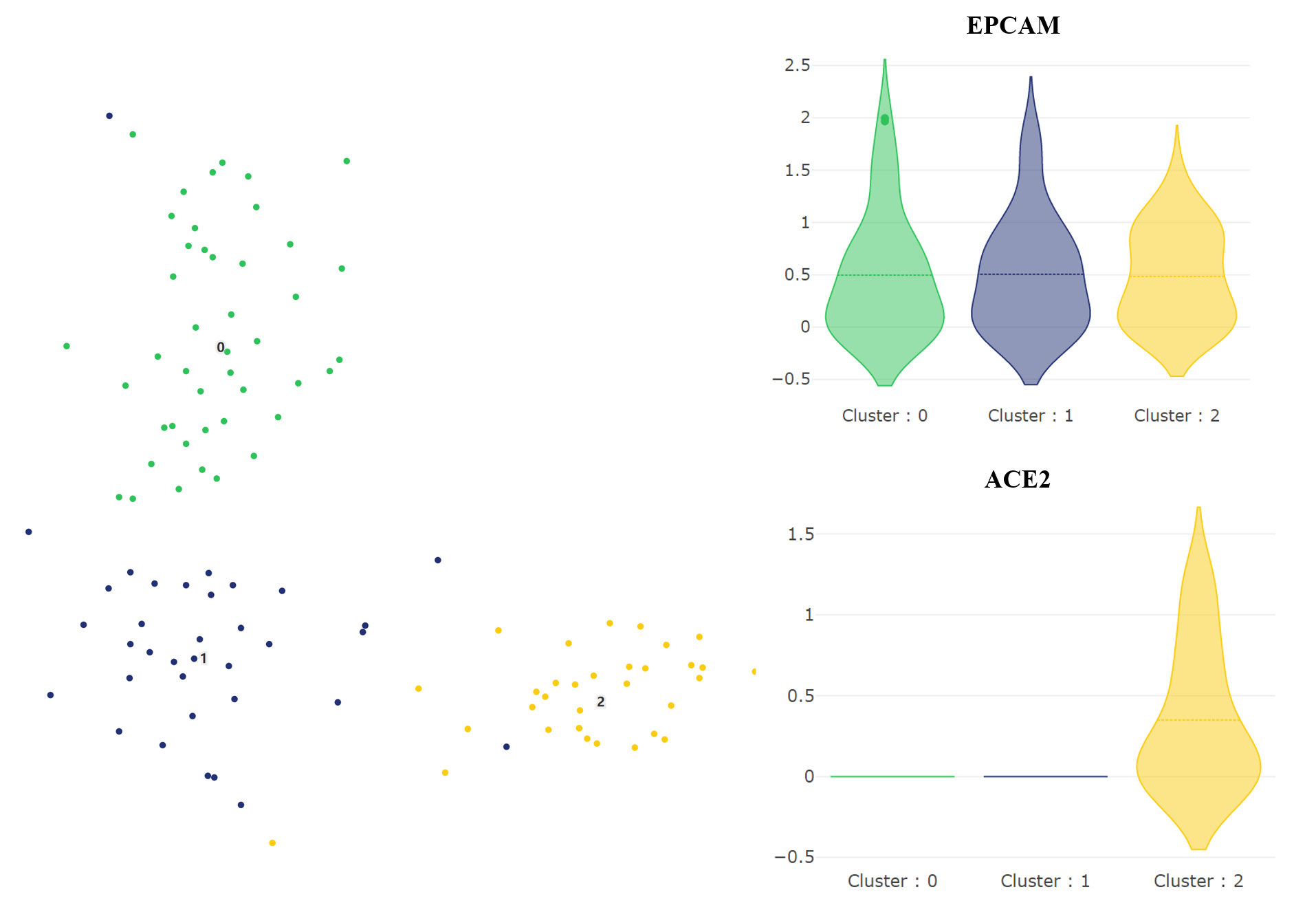 由于從上圖中可以看到,ACE2只在膽管細(xì)胞的一部分細(xì)胞中存在表達(dá),所以我們可以通過(guò)單細(xì)胞分析平臺(tái)對(duì)膽管細(xì)胞所在的cluster進(jìn)行re-cluster,獲得更細(xì)致的分類。分析共得到三個(gè)亞群,結(jié)果發(fā)現(xiàn)ACE2特異性的只在其中一個(gè)cluster中表達(dá)(圖3)。