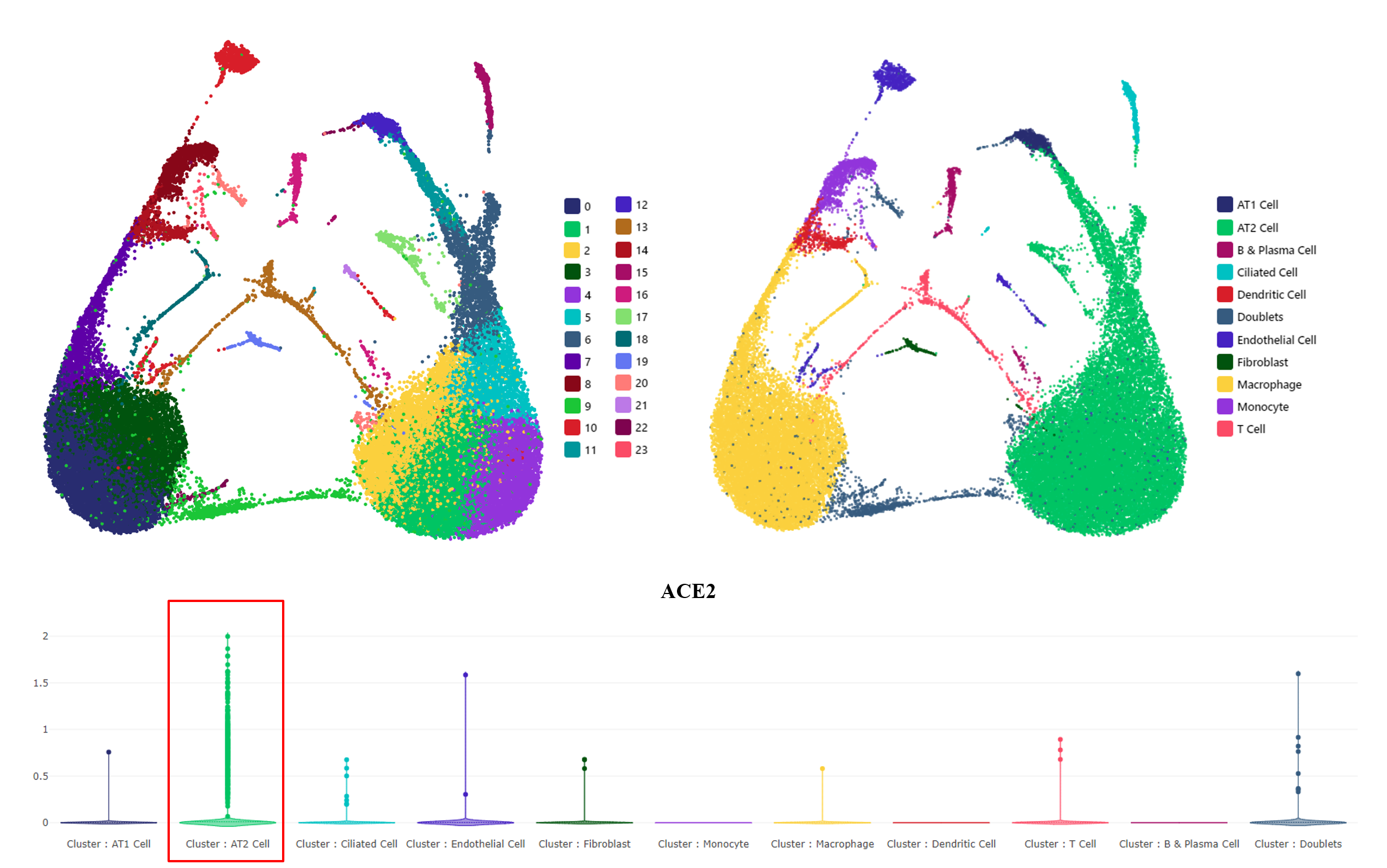 通過(guò)單細(xì)胞瀏覽器(SingleCell Browser)對(duì)Marker Gene的表達(dá)進(jìn)行檢索,可以對(duì)細(xì)胞類型進(jìn)行初步鑒定,發(fā)現(xiàn)共有I型肺泡上皮細(xì)胞(混入一小部分基底細(xì)胞和棒狀細(xì)胞,需細(xì)分才能區(qū)分)、II型肺泡上皮細(xì)胞、纖毛細(xì)胞、內(nèi)皮細(xì)胞、成纖維細(xì)胞、單核細(xì)胞、巨噬細(xì)胞、樹突狀細(xì)胞、T細(xì)胞、B細(xì)胞、漿細(xì)胞以及部分潛在的雙細(xì)胞群體(同時(shí)表達(dá)兩種細(xì)胞類型的Marker)。通過(guò)對(duì)ACE2的表達(dá)進(jìn)行檢索,發(fā)現(xiàn)其主要表達(dá)在II型肺泡上皮細(xì)胞中(圖5)。