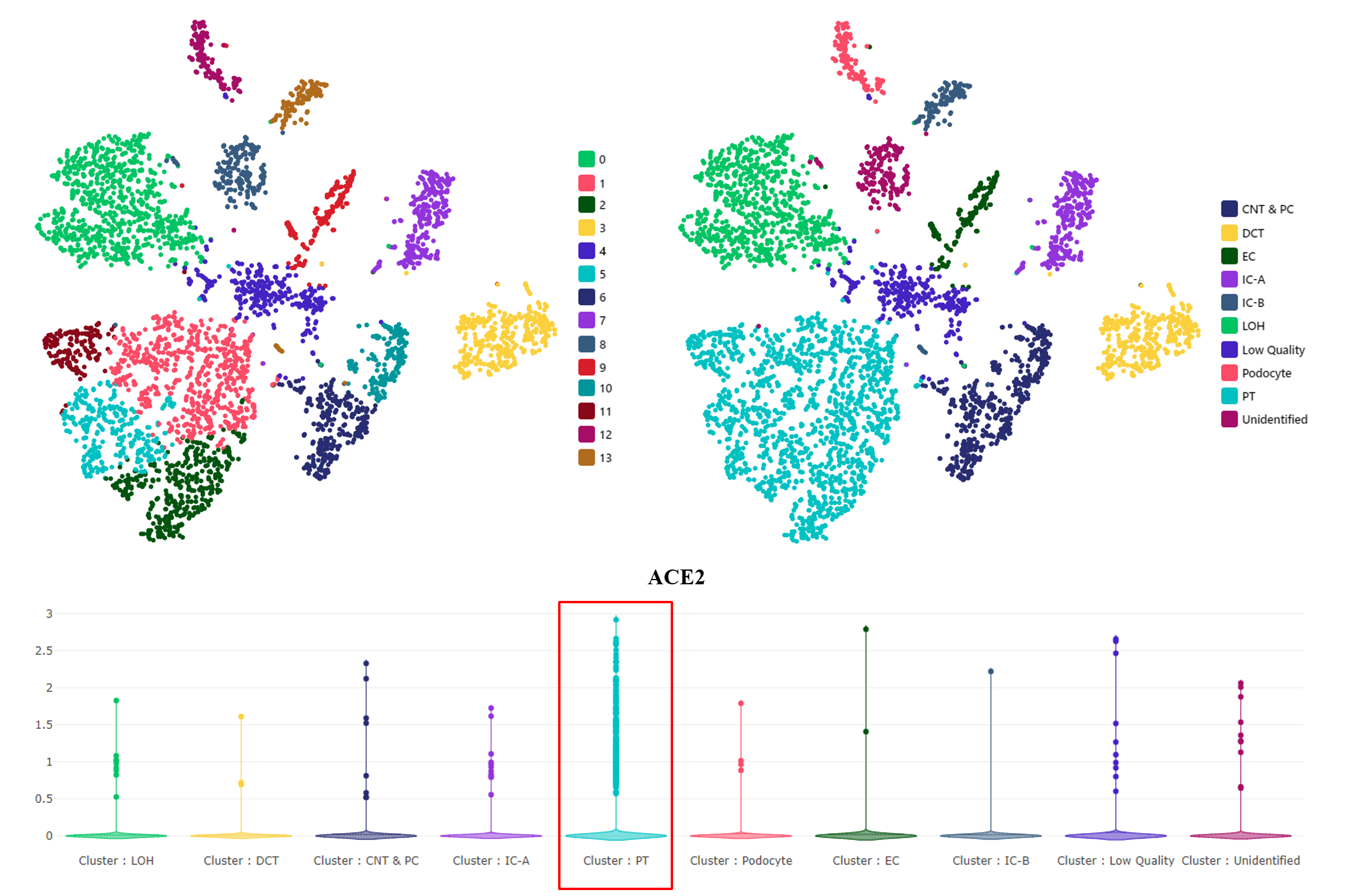 通過(guò)單細(xì)胞瀏覽器(SingleCell Browser)對(duì)Marker Gene的表達(dá)進(jìn)行檢索,可以對(duì)細(xì)胞類型進(jìn)行初步鑒定,發(fā)現(xiàn)共有近端腎小管、連接小管、集合管、遠(yuǎn)曲小管、足細(xì)胞、亨利氏袢、潤(rùn)細(xì)胞。通過(guò)對(duì)ACE2的表達(dá)進(jìn)行檢索,發(fā)現(xiàn)其主要表達(dá)在近端腎小管中(圖6)。