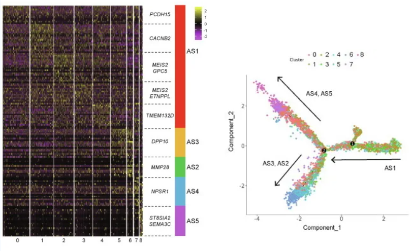 膠質(zhì)細(xì)胞亞群中,作者確定了靈長(zhǎng)類(lèi)動(dòng)物特有的兩種新的星形膠質(zhì)細(xì)胞亞型(AS4和AS5), NPSR1選擇性地富集在AS4細(xì)胞群, 而T8SIA2和SEMA3C則選擇性地高表達(dá)在AS5細(xì)胞群。靈長(zhǎng)類(lèi)動(dòng)物特異性的星形膠質(zhì)細(xì)胞亞型可能會(huì)導(dǎo)致神經(jīng)回路的形成。