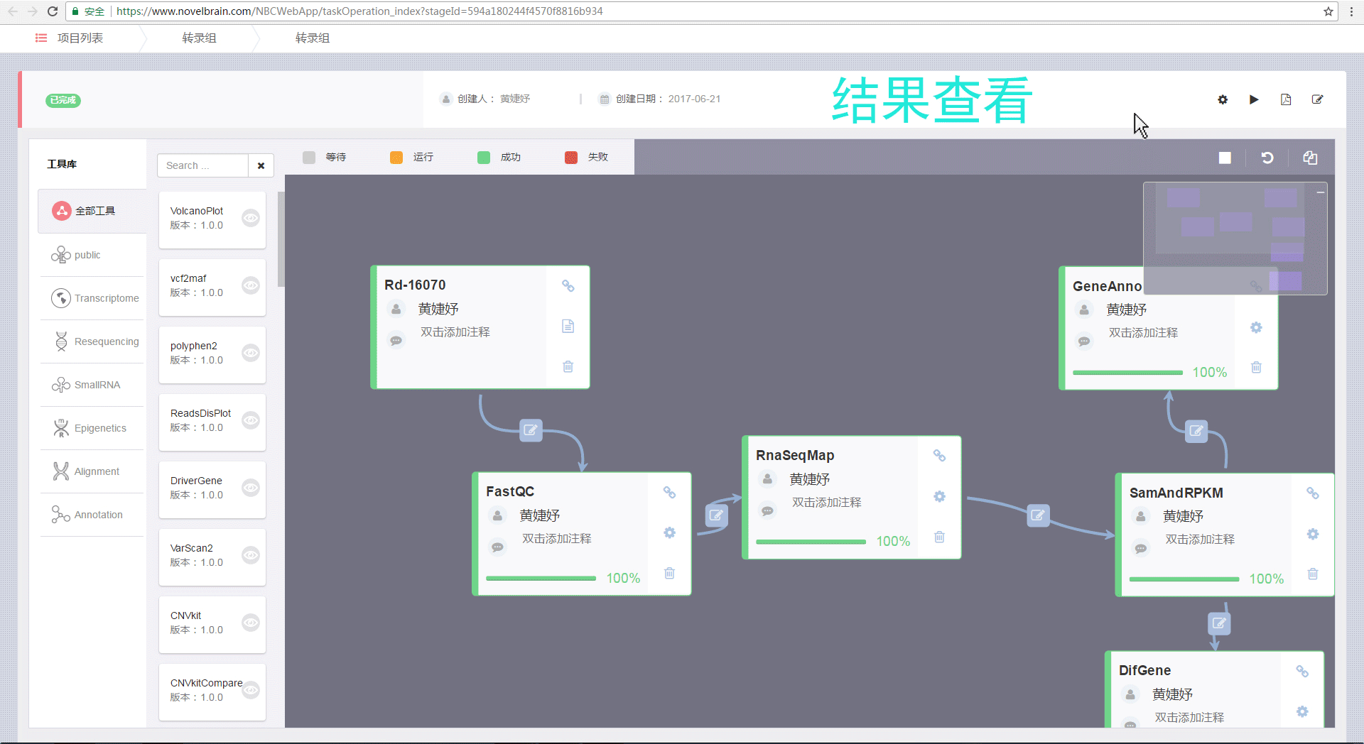NovelBrain®云計算平臺的操作界面簡潔人性化,只需拖拽task,添加自己想要做的分析項目,工作流可一鍵運行。平臺中已經(jīng)基本覆蓋了常用分析所需要的工作流模板,當(dāng)然,你可以隨心所欲創(chuàng)建自己想要的工作流模板,完全定制自己的分析!