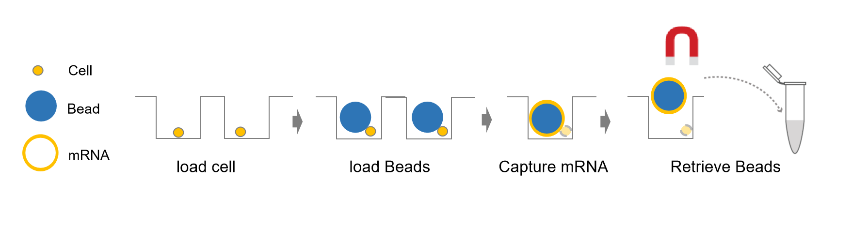 微孔板內(nèi)均勻排布正六邊形結(jié)構(gòu),像質(zhì)密排列的“蜂巢”,為每個(gè)細(xì)胞和磁珠建造好了20萬+的小房子,每個(gè)“小房子”直徑50μm,基于“泊松分布”的原理,上樣細(xì)胞和磁珠自然沉降至微孔內(nèi),保證每個(gè)微孔只落入一個(gè)Bead+細(xì)胞,形成獨(dú)立的反應(yīng)環(huán)境。PanoCell雙通道微孔芯片的細(xì)胞捕獲效率高達(dá)80%,即使上樣細(xì)胞數(shù)近萬個(gè),也能保證較低的雙細(xì)胞率。