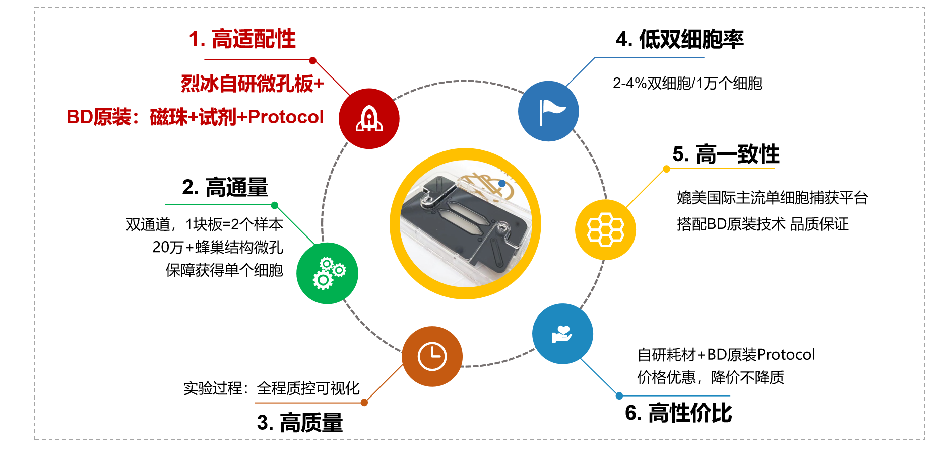作為扎根生物醫(yī)藥測序行業(yè)十年的烈冰生物,在18年進(jìn)軍單細(xì)胞領(lǐng)域時(shí)就意識(shí)到了這個(gè)問題,并隨即啟動(dòng)了“烈冰智造計(jì)劃”,致力于單細(xì)胞測序技術(shù)的突破和創(chuàng)新,以滿足國內(nèi)研究人員和臨床醫(yī)生多元化的需求。歷經(jīng)三年磨礪,烈冰生物成功突破國外技術(shù)壟斷壁壘,發(fā)布第一款,用于單細(xì)胞測序的實(shí)驗(yàn)耗材——PanoCell雙通道微孔芯片!該芯片完美適配BD平臺(tái)全套原裝試劑,磁珠和Protocol,實(shí)現(xiàn)國產(chǎn)芯片和國際主流平臺(tái)的完美結(jié)合,為單細(xì)胞測序提供高質(zhì)量、高效率、高性價(jià)比的服務(wù)方案!