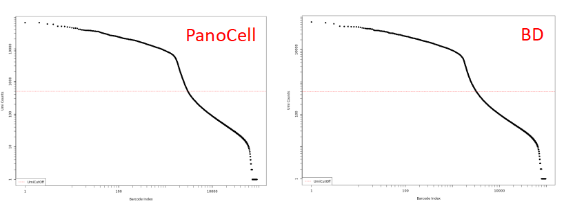 眾所周知,單細(xì)胞測(cè)序需在分析過程中根據(jù)Cell Barcode確認(rèn)有效的細(xì)胞數(shù)量。我們對(duì)同一細(xì)胞懸液,隨機(jī)分選相同細(xì)胞數(shù)量后進(jìn)行上機(jī)捕獲,以默認(rèn)按UMI500條件篩選細(xì)胞(低于UMI500的很可能是懸液中游離RNA或細(xì)胞碎片)結(jié)果顯示,兩種微孔板得到的曲線情況非常接近。