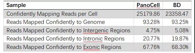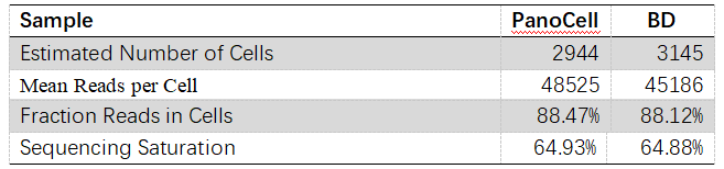②Mean Reads per Cell:均在45K reads以上,符合單細(xì)胞數(shù)據(jù)分析標(biāo)準(zhǔn),其中PanoCell :48.5k reads per cell,BD:45.18k reads per cell;