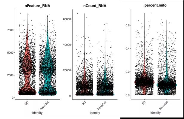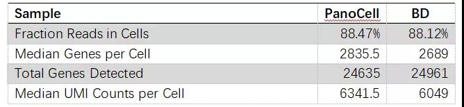 ①捕獲細(xì)胞數(shù)量:兩個(gè)樣本分別捕獲2944個(gè)細(xì)胞(PanoCell)和3145個(gè)細(xì)胞(BD);