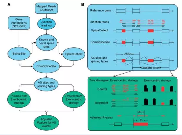 高通量測(cè)序是研究可變剪接的強(qiáng)有力工具,并且已經(jīng)開發(fā)出了一系列算法工具去對(duì)可變剪接事件進(jìn)行分析。這類算法主要可以分成兩大類,一類是基于全長(zhǎng)轉(zhuǎn)錄本的分析策略(以轉(zhuǎn)錄本為中心),另一類是基于外顯子或事件或轉(zhuǎn)錄本區(qū)域的分析策略(以區(qū)段為中心)。前者主要有Cuffdiff,BitSeq,rSeqNP等,這些算法能夠?qū)D(zhuǎn)錄本進(jìn)行定量及差異分析,并且嘗試去捕獲到單個(gè)基因內(nèi)部可能存在的多種復(fù)雜的可變剪接情況。而相反的,以JuncBase,rMATS或者DEXSeq為代表的后者,則試圖對(duì)參與可變剪接的外顯子的歸屬進(jìn)行判斷,從而提高可變剪接的檢測(cè)效率。所有這些方法很大程度上依賴于參考基因組中轉(zhuǎn)錄本的注釋信息。然而截至目前,對(duì)于人類參考基因組轉(zhuǎn)錄本的注釋信息也并不是十分完整。除此之外,一些可變剪接的情況可能只在特定的細(xì)胞或者條件下產(chǎn)生。雖然三代測(cè)序已經(jīng)能夠獲得全長(zhǎng)轉(zhuǎn)錄本信息,但是其高昂的成本仍然限制了其被廣泛應(yīng)用于轉(zhuǎn)錄組的研究中,因此以區(qū)段為中心的分析策略依舊是目前分析可變剪接事件的必要工具。
