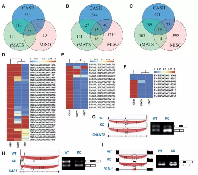 為了更進(jìn)一步評(píng)估CASH預(yù)測(cè)到的結(jié)果,我們選取了45個(gè)(其中22個(gè)是新的)僅CASH預(yù)測(cè)到的可變剪接基因,進(jìn)行RT-PCR驗(yàn)證,結(jié)果顯示71%(32/45)以上的陽(yáng)性結(jié)果,包括GALN2,CAST以及PATL1中新的可變剪接事件。暗示著CASH能夠在無(wú)生物學(xué)重復(fù)樣本的比較中顯著提高差異可變剪接,特別是新的可變剪接事件的檢測(cè)效率。