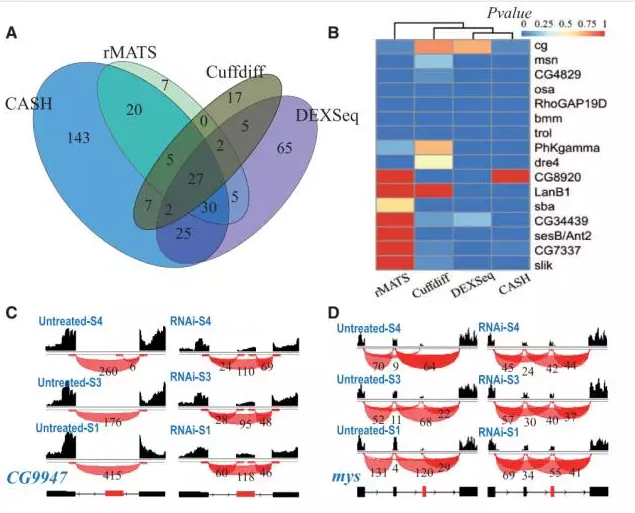 3、與此同時(shí),我們又評(píng)估了CASH在有生物學(xué)重復(fù)樣本中的檢測(cè)效率。與Cuffdiff,DEXSeq和rMATS相比,CASH檢測(cè)到了更多的差異可變剪接事件。RT-PCR結(jié)果顯示CASH的驗(yàn)證率好于其他幾種算法,同樣地,CASH能夠檢測(cè)到CG9947和mys中新的可變剪接事件。綜合這兩個(gè)測(cè)試表明,CASH既能夠在有生物學(xué)重復(fù)的樣本,也能夠在無(wú)生物學(xué)重復(fù)的樣本中提高差異可變剪接檢測(cè)率,尤其是新的可變剪接事件。