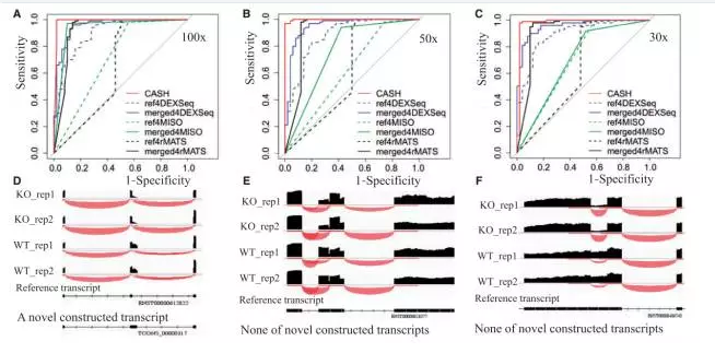 4、下一步,我們利用Flux模擬器模擬了一系列數(shù)據(jù),其中包含已有注釋的以及新的差異可變剪接事件,測(cè)序深度分為30x,50x和100x。結(jié)果顯示MISO,rMATS以及DEXSeq在使用重建后轉(zhuǎn)錄本的情況下,其檢測(cè)效率要高于使用參考基因組,但還是顯著低于CASH。即使是在30x的數(shù)據(jù)量下,CASH依舊能夠維持著極高的敏感性及特異性。