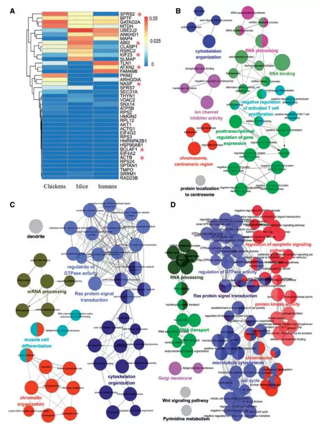 5、在此基礎(chǔ)上,我們利用CASH在雞、小鼠和人類中研究了SRSF10介導(dǎo)的可變剪接事件,并進(jìn)行了物種間的比較。我們發(fā)現(xiàn)了41個(gè)基因在三個(gè)物種間都受到了SRSR10的調(diào)控,但是只有7個(gè)(星標(biāo))發(fā)生了一致的可變剪接事件,暗示著SRSF10的調(diào)控方式在物種間是非常靈活的。通過(guò)GO和pathway的分析,我們發(fā)現(xiàn)受SRSF10調(diào)控的基因功能在物種間具有一定的保守性,這些基因參與了許多基礎(chǔ)的生物學(xué)過(guò)程包括細(xì)胞骨架、染色質(zhì)結(jié)構(gòu)以及RNA加工過(guò)程等,同時(shí)也存在著些許差別。