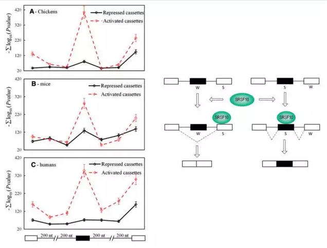 6、之前的研究表明,SRSF10擁有一個(gè)保守的RNA識(shí)別基序,能夠結(jié)合AGAGAV或者AAAGACAAA。我們對(duì)cassette類型可變剪接中的序列信息進(jìn)行了分析,發(fā)現(xiàn)在三個(gè)物種中有一個(gè)共同的調(diào)控模式。通過(guò)更深入的分析后,我們提出了一種SRSF10介導(dǎo)的剪接模型,當(dāng)外顯子具有GA富集的特征時(shí),通常能夠與SRSF10具有更高的親和力,因此當(dāng)GA富集出現(xiàn)在下游外顯子時(shí),會(huì)導(dǎo)致cassette外顯子的跳躍,而GA富集發(fā)生在cassette外顯子上時(shí),則會(huì)發(fā)生該外顯子納入的情況。并且這種調(diào)控模式在雞、小鼠和人類中都高度保守。
