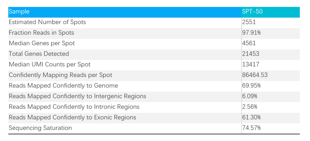 測序數(shù)據(jù)分析及統(tǒng)計表明,NovelPano®-SPtissue芯片在檢測基因數(shù)和檢測轉(zhuǎn)錄本數(shù)量上表現(xiàn)優(yōu)異,小鼠腦組織樣本捕獲總基因數(shù)21453個,中位數(shù)基因4561,數(shù)據(jù)統(tǒng)計分析環(huán)節(jié)各參數(shù)均達(dá)到較高的水平。