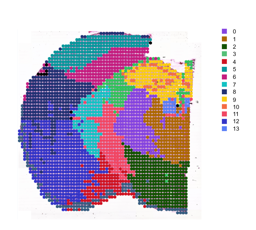 腦組織切片HE染色(左),切片點(diǎn)陣聚類Cluster(右)
