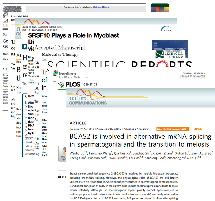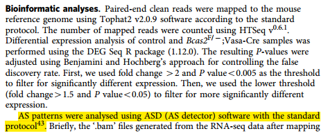 2017年1月27日,一篇題為“BCAS2 is involved in alternative mRNA splicing in spermatogonia and the transition to meiosis”的文章在線發(fā)表于Nature Communications(IF=12.124),研究團(tuán)隊(duì)為中國(guó)科學(xué)院動(dòng)物研究所干細(xì)胞與生殖國(guó)家重點(diǎn)實(shí)驗(yàn)室李磊研究員課題組,研究結(jié)果發(fā)現(xiàn)BCAS2作為可變剪接調(diào)節(jié)因子,參與精原干細(xì)胞中前體RNA的正確剪接和減數(shù)分裂正常啟動(dòng),ASD算法在該工作中被應(yīng)用于可變剪接的檢測(cè)和分析[8]。該研究首次揭示了可變剪接在精子發(fā)生過(guò)程中調(diào)控減數(shù)分裂啟動(dòng)這一重要事件,為哺乳動(dòng)物減數(shù)分裂啟動(dòng)研究提供了新的思路,并為可變剪接生理功能研究提供了重要理論依據(jù)。
