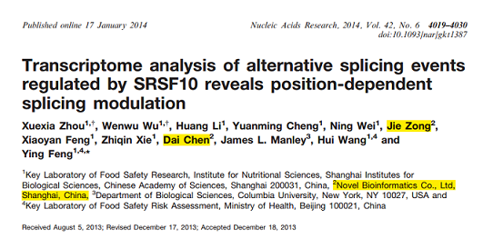 數(shù)據(jù)分析起家的烈冰很早便開(kāi)始關(guān)注可變剪接,早在2014年即自主研發(fā)了選擇性剪接分析軟件(ASD,Alternative Splicing Detector,網(wǎng)址:http://chengcaifu.cn/asd/ASD.html),協(xié)助中科院營(yíng)養(yǎng)所馮英組對(duì)雞細(xì)胞系的高通量測(cè)序數(shù)據(jù)進(jìn)行生物信息分析,首次揭示了選擇性剪接蛋白SRSF10在細(xì)胞內(nèi)調(diào)節(jié)的靶底物以及其調(diào)控mRNA選擇性剪接的機(jī)制,相關(guān)文章發(fā)表于學(xué)術(shù)期刊Nucleic Acids Research(IF=10.162)[1]。之后,馮老師課題組在可變剪接領(lǐng)域持續(xù)發(fā)力,連續(xù)發(fā)表數(shù)篇高質(zhì)量文章[2-7]。